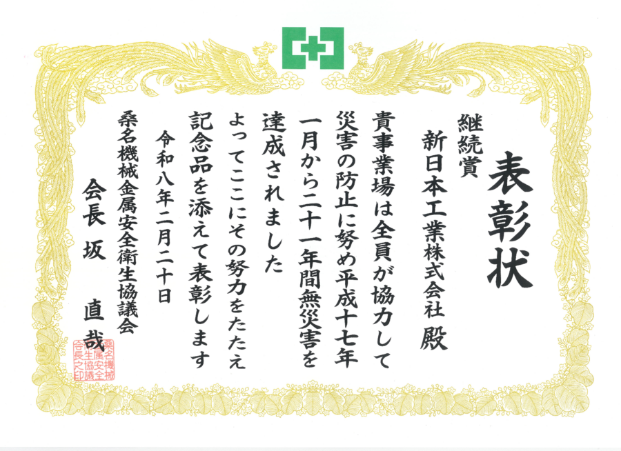 当協議会の無災害表彰規程に定める期間無災害を達成した事業場を表彰している。今般貴事業場におかれましては、昨年12月末日までに21年間継続して無災害記録を達成されたため、継続賞の表彰対象に選定されました。